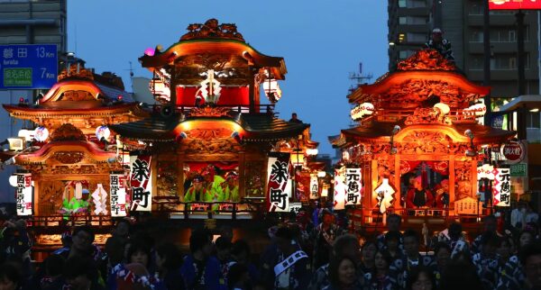 夜になると市街地では豪華な装飾が施された御殿屋台が登場し、町中を練り