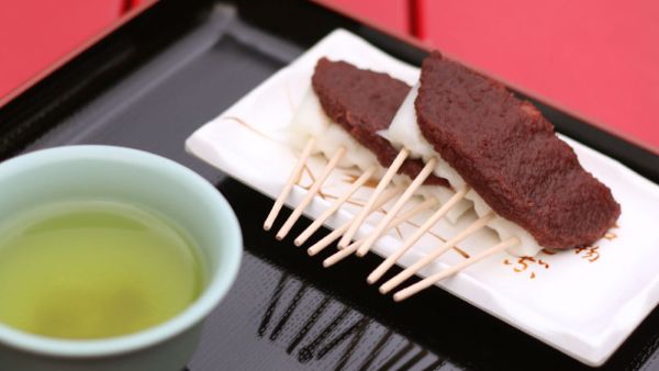このお団子は、五穀豊穣を願う五本の串が特徴で、あんこの優しい甘さが