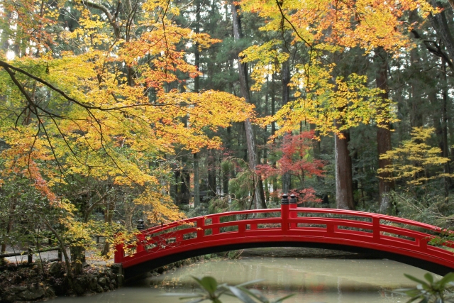 樹齢100年以上のモミジが点在し、社殿や橋とのコントラストが見事です。
