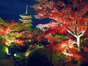 東寺では紅葉シーズンにあわせて夜間ライトアップが実施されます。